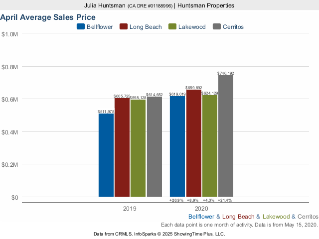 As of the end of April, the Long Beach average single family home price increased almost by 9% compared to one year ago. The Cerritos single family home price increased by over 21%, Bellflower increased over 20%, while Lakewood increased by 4%.